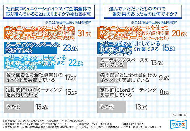 そこで「社員間コミュニケーションについて企業全体で取り組んでいること」を聞くと、「コミュニケーションツールを使っている(チャット/社内SNS/仮想空間オフィス/コラボレーションツールなど)」31.6%が最多で、「ミーティングスペースを設けている」23.9%、「フリーアドレス制にしている(好きな席に座って作業できるワークスタイル)」22.6%が続いた。コミュニケーションツールは「一番効果があったもの」でもトップだ。