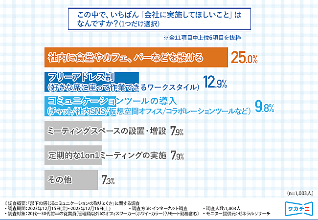 最後にコミュニケーション活性化の施策として「会社に実施してほしいこと」を聞くと、「社内に食堂やカフェ、バーなどを設ける」25.0%が多く、「フリーアドレス制」12.9%、「コミュニケーションツールの導入(チャット/社内SNS/仮想空間オフィス/コラボレーションツールなど)」9.8%を大きく上回った。リアルかつカジュアルなコミュニケーションがコロナ禍以降の職場交流ではポイントとなりそうだ。