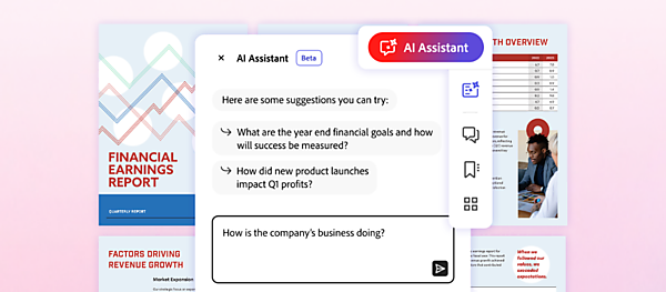 AI Assistantは、直感的な会話型インターフェースでPDFの内容に応じた質問を提案し、ユーザーの質問に回答する。読みやすい書式と手短な概要を作成して、長文ドキュメントの迅速な理解が可能になる。独自AIで引用を生成するので、ユーザーは回答の情報ソースを容易に確認できる。クリック可能なリンクで長文ドキュメントから必要なものを素早く見つけ、AI Assistantに指示して利用目的に合わせた文書を生成することができる。