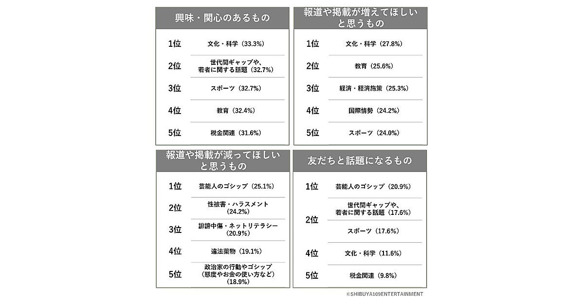 そこで「興味関心のあるニュースジャンル」について聞くと、「文化・科学」33.3%、「世代間ギャップや若者に関する話題」32.7%、「スポーツ」32.7%が上位。「報道や掲載が増えて欲しいと思うジャンル」でも文化・科学」27.8%が最多で、「教育」25.6%、「経済・経済施策」25.3%が続いた。