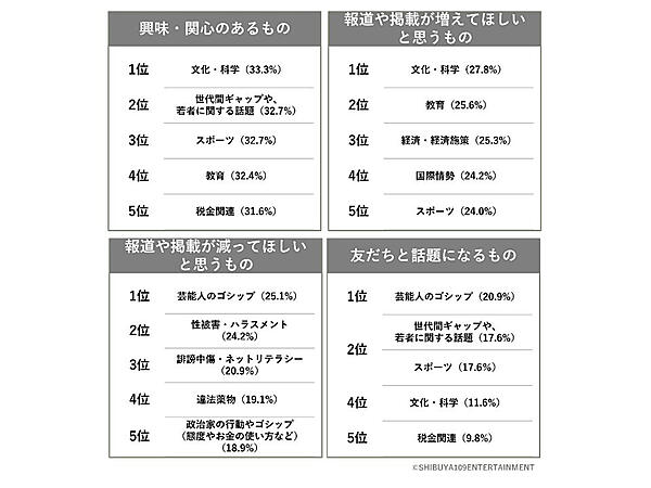 「報道や掲載が減って欲しいと思うジャンル」では「芸能人のゴシップ」25.1%、「性被害・ハラスメント」24.2%、「誹謗中傷・ネットリテラシー」20.9%が上位だったが、「友だちと話題になるジャンル」は「芸能人のゴシップ」20.9%が1位だった。