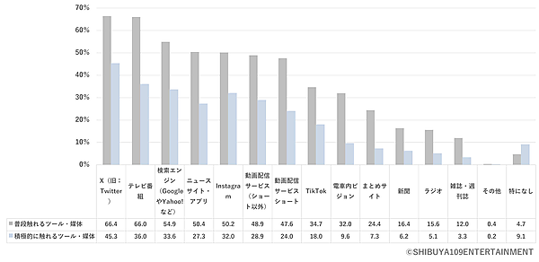 「ふだんニュースや時事ネタの情報収集に使用しているツールや媒体」では「X(旧:Twitter)」66.4%が最多で、「テレビ番組」66.0%、「検索エンジン(GoogleやYahoo!など)」54.9%、「ニュースサイト・アプリ」50.4%などを上回る。