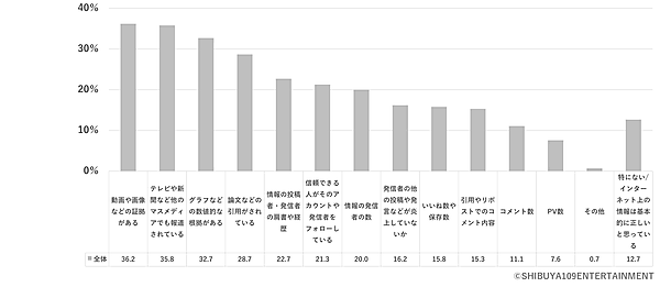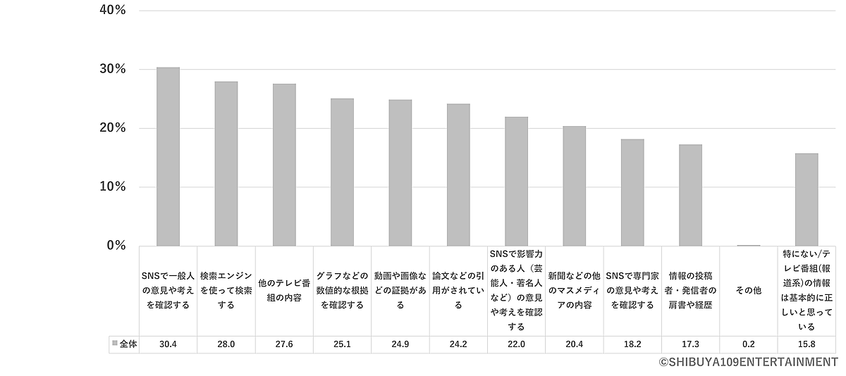 また情報の真偽の判断(ファクトチェック)については、「動画や画像などの証拠がある」36.2%、「テレビや新聞など他のマスメディアでも報道されている」35.8%、「グラフなどの数値的な根拠がある」32.7%が重視されている一方で、テレビ番組の情報のファクトチェックについては、「SNSで一般人の意見や考えを確認する」30.4%、「検索エンジンを使って検索する」28.0%が上位で、ネットで裏付けを求める様子が明らかとなっている。