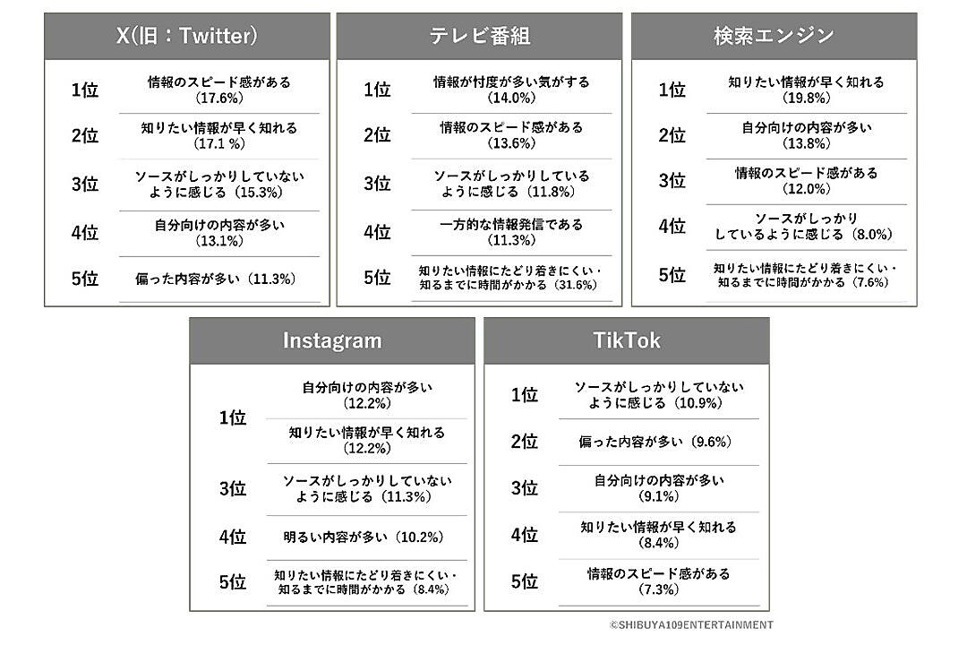 その使い分けについて聞くと、X(旧:Twitter)は「最新の情報を知る」25.4%が多く、テレビは「たまたま時事問題やニュースの情報が目に入ってくる」24.2%、検索エンジンは「手軽・気軽に情報を得る」26.7%だった。各メディアのイメージについても、X(旧:Twitter)は「情報のスピード感がある」17.6%、テレビは「情報に忖度が多い気がする」14.0%、検索エンジンは「知りたい情報が早く知ることができる」19.8%が最多で、大きく異なっている。