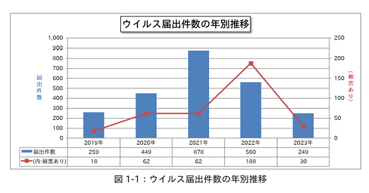 それによると、2023年に寄せられたウイルス届出は、前年(560件)から311件減少し、249件。このうちウイルス感染被害(実被害)は30件だった。2023年に寄せられたウイルスなどの検出数は、前年の104万1,775個より45万9,153個減少し58万2,622個だった。