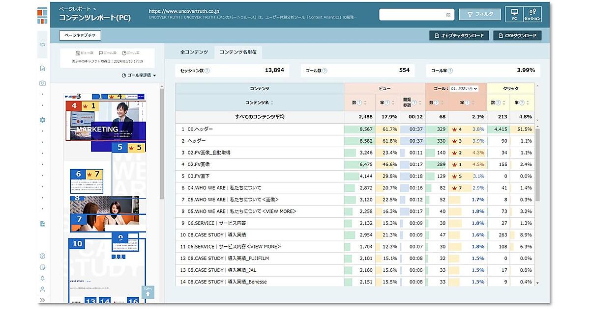 デジタルマーケティング支援事業のUNCOVER TRUTHは、同社が提供するウェブページ内の画像やテキストごとの成果数値化ツール「Content Analytics」が、LPO(ランディングページ最適化)プラットフォーム事業のDLPOのLPOツール「DLPO」とデータ連携した、と2月27日発表した。DLPOで作成したABテストのA・B案それぞれの効果を数値化する。