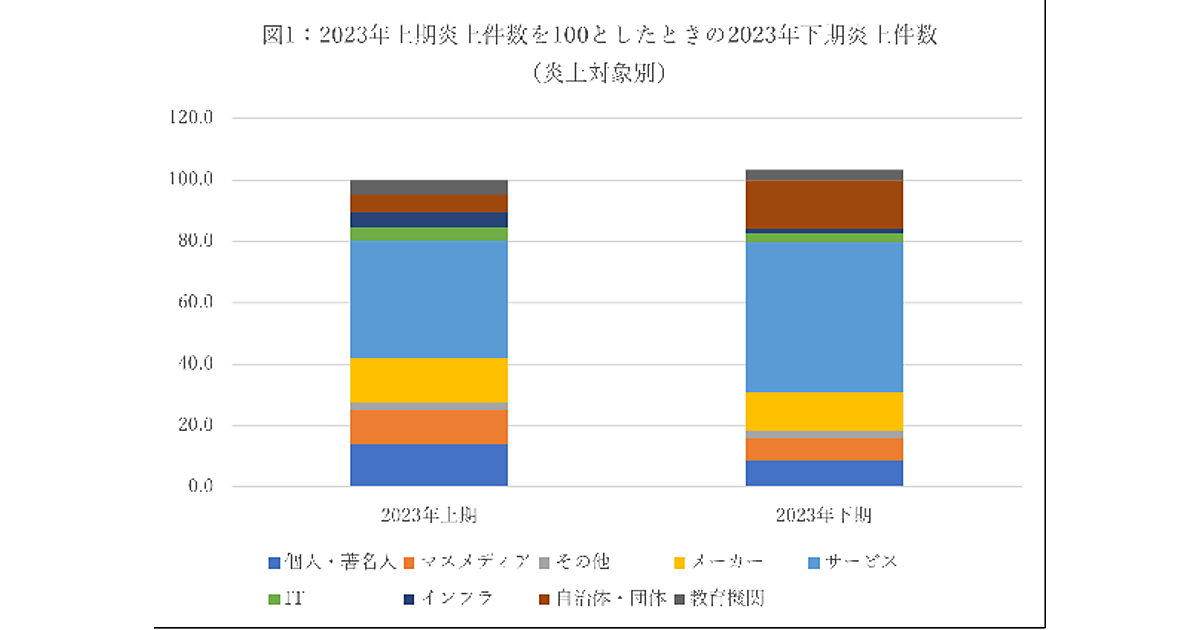 2023年下期(2023年7月~12月)のネット炎上件数は、2023年上期(2023年1月~6月)から3.4%増加。業種別では「サービス」の炎上件数が増加している。また「自治体・団体」の炎上も多く2023年上期の6%から下期には15%まで増加している。