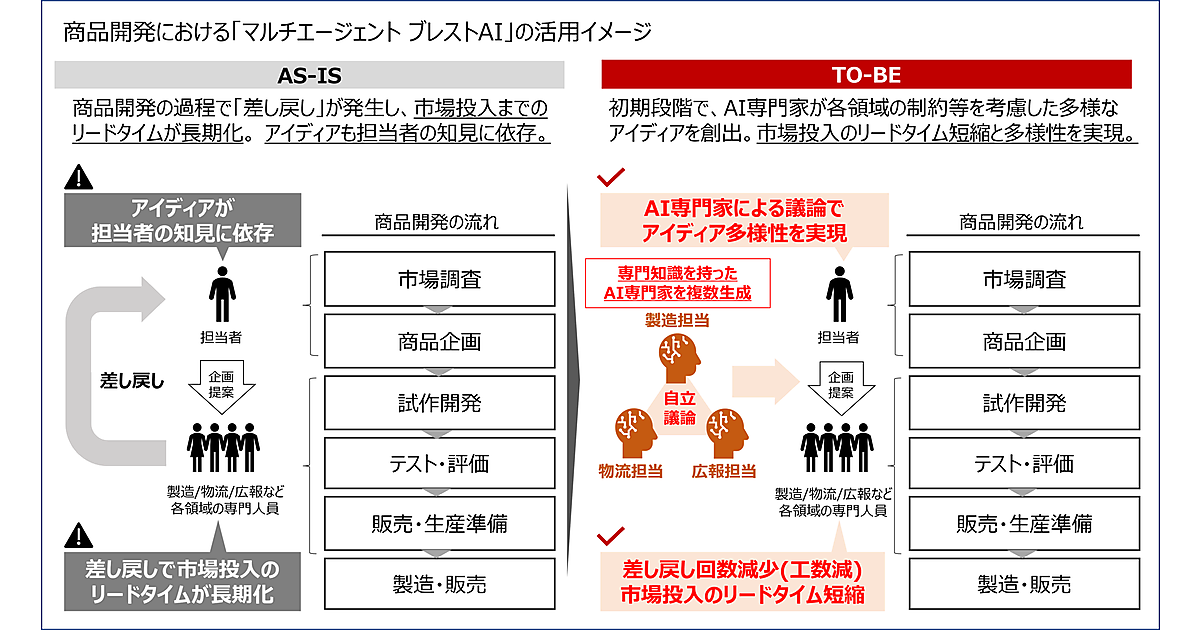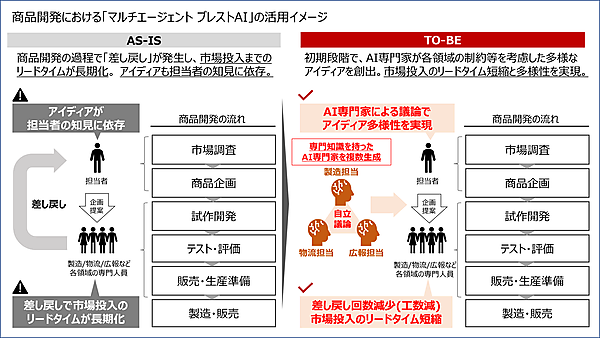 顧客ニーズの多様化で商品企画や開発には専門知識が必要になっているが、初期の商品企画段階から多くの専門知識を持つ人材を巻き込んで打合せや検討を重ねるのは人材確保や工数の面で現実的でなかった。独自開発したAIは、専門知識や人格を持ったAI(ペルソナ)の自由な生成が可能。科学的な検証や理論を基にしたペルソナ同士の議論設計による最適な結論や、新規性のある企画生成、議論過程や根拠の可視化ができる。