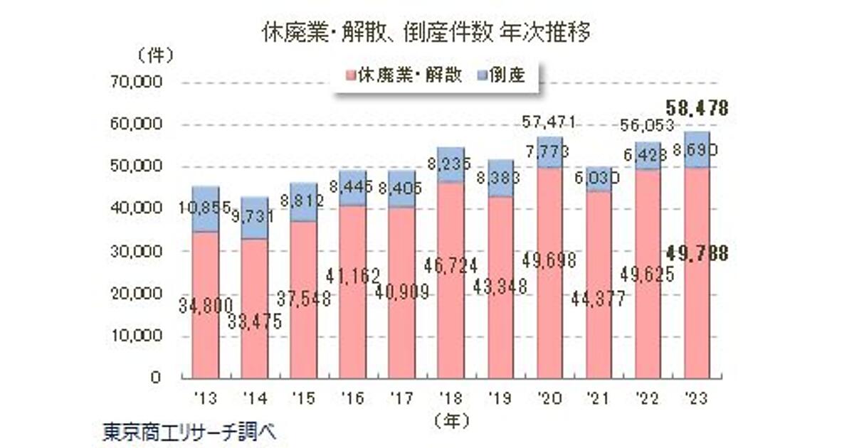 まず2023年における「休廃業・解散」企業は、4万9,788件で2年連続で増加。最多だった2020年(4万9,698件)をわずかながら上回り、過去最多を更新した。2023年の企業倒産は8,690件(前年比35.1%増)と大幅に増加しており、休廃業・解散と倒産を合算した「退出企業」は5万8,478件(同4.3%増)で、2020年の5万7,471社を超え最多となった。