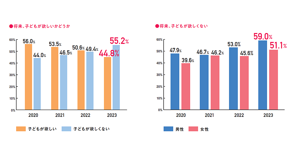 まず、若年未婚男女(18~29歳)に対し、「子どもが欲しいかどうか」を聞くと、「今も将来も欲しいとは思わない」と回答した人は全体で55.2%にのぼった。男性では59.0%・女性では51.1%となり、男女ともに半数を超えていた。