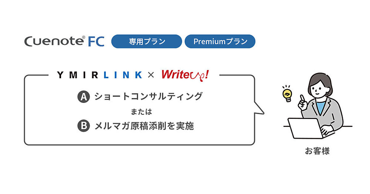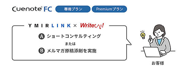 ①はメール配信システム「Cuenote FC」を新規導入した企業に「ショートコンサルティング」か「メルマガ原稿添削」のいずれかを提供する。コンサルはコンテンツや頻度・時間など新規でメールマーケティングを始める際のポイントで最大1.5時間の打合せを実施。原稿添削は開封率やクリック率改善の観点で添削して5営業日内を目安に戻す。大手企業のメールマーケティングに支援実績を持つライトアップと協力して提供する。