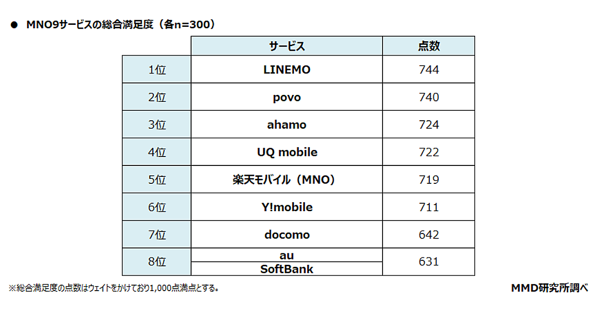 続いて、利用しているサービスの総合満足度を聞いたところ、1位は「LINEMO」で744pt、2位は「povo」で740pt、3位は「ahamo」で724ptとなり、オンライン専用プランが上位を占める結果となった。