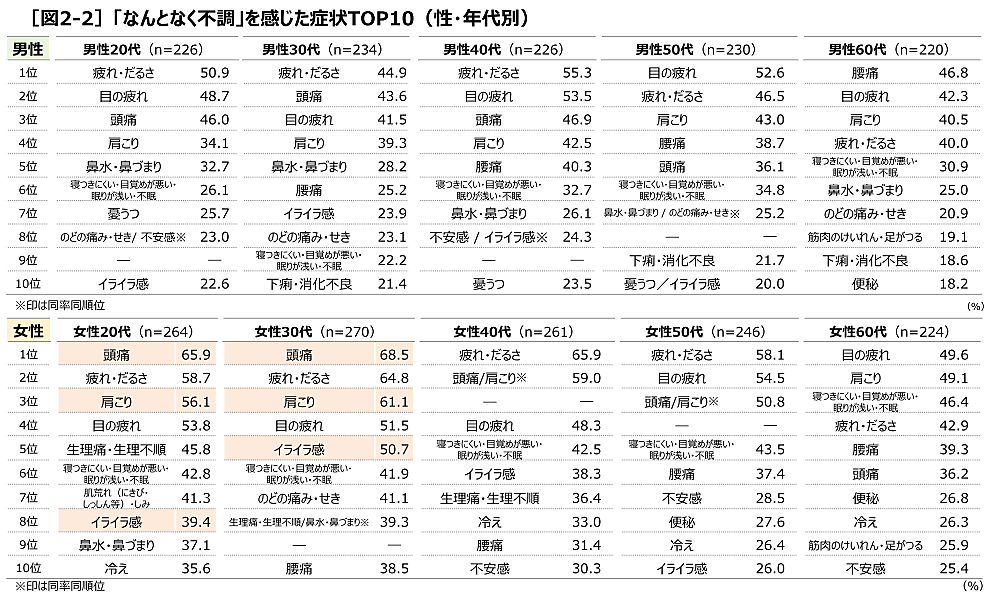 年代別も加味すると、「疲れ・だるさ」「目の疲れ」はどの性・年代でも高いが、「頭痛」が20代・30代の女性に特に多い。男性は60代で「腰痛」がトップに躍り出た。
