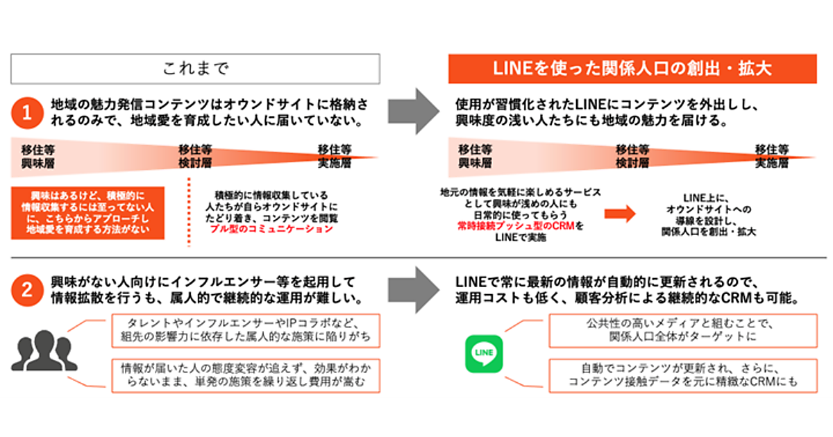 新潟県が保有するLINEアカウント「まるっと新潟ちゃんねる」で県出身者や居住経験者に馴染み深い新潟のテレビ番組などの魅力紹介コンテンツを活用し、新潟県と関係人口の間に継続的で双方向なつながりをつくる。幅広い世代・年齢・性別がユーザーのLINEを活用することで県出身者が興味・関心をもつ情報の集約・分析が見込まれ、関係人口の創出・拡大に必要な情報発信の内容を探り、サービスの実用化に向けて検証していく。