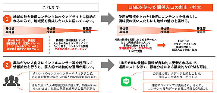 博報堂は、新潟博報堂、新潟県と共同でLINEアカウント「まるっと新潟ちゃんねる」を開設し、「LINE」を活用して地域の「関係人口」を育成するソリューション開発をめざす実証実験を3月8日から8月31日まで行う、と3月8日に発表した。ローカルメディアや自治体のアーカイブ化された既存コンテンツをLINEで配信し、運用コストを抑えながら常時接続プッシュ型CRM(顧客情報管理)を実施し、地域の関係人口を創出・拡大する。