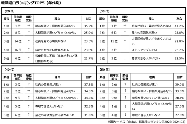 年代別で見ると、20代、30代では総合ランキングと同じく「給与が低い・昇給が見込めない」がトップに。特に30代では41.2%にのぼり、前年度比で5.1ポイント上昇していた。40代、50代では「社内の雰囲気が悪い」が最も多かった。