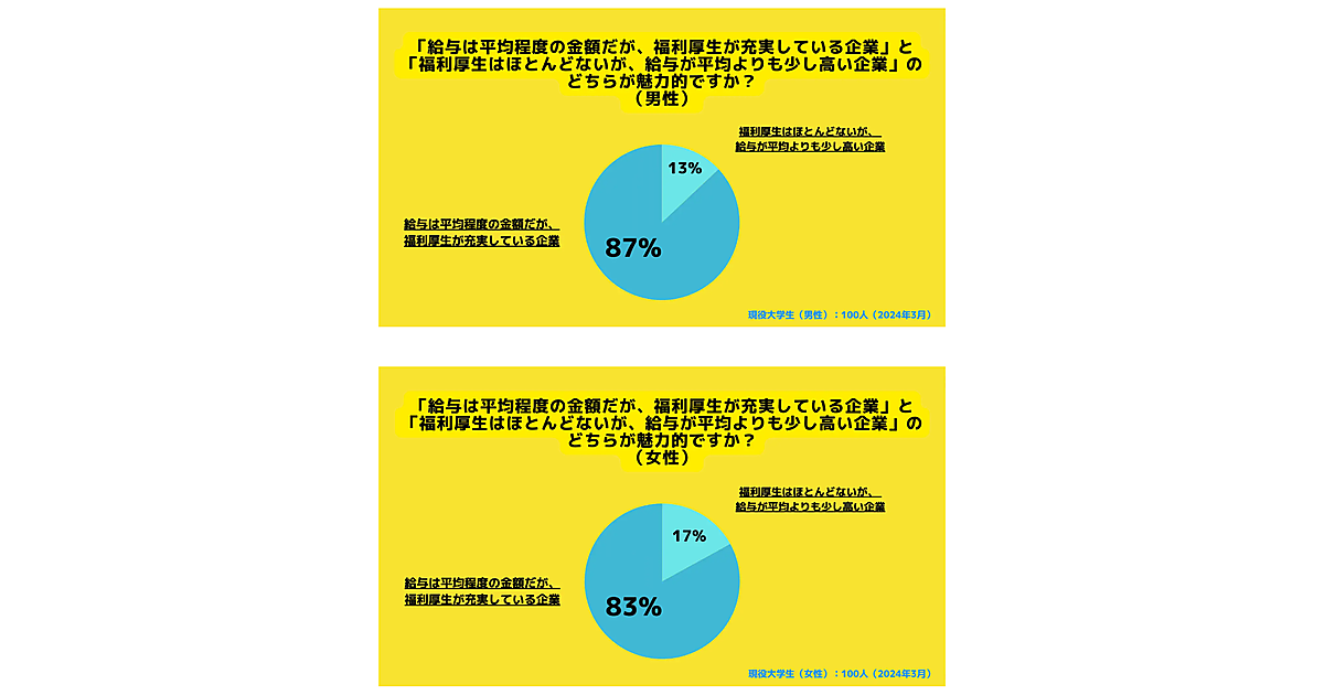 また、「給与は平均程度の金額だが、福利厚生が充実している企業」と「福利厚生はほとんどないが、給与が平均よりも少し高い企業」のどちらが魅力的かを聞くと、男子大学生では87%・女子大学生では83%が「福利厚生が充実している企業」の方を選んだ。