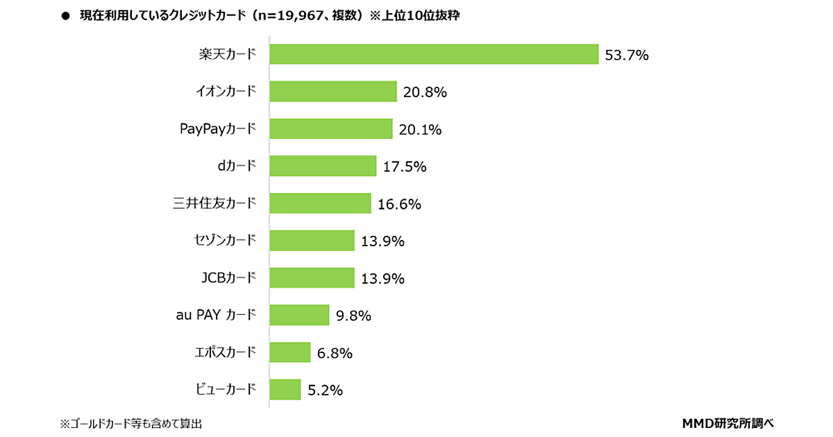 「クレジットカードの利用」について聞くと、79.9%(19,967人)が「利用している」と回答。「現在利用しているクレジットカードブランド」では「楽天カード」53.7%が特に多く、「イオンカード」20.8%、「PayPayカード」20.1%がそれに続いた。