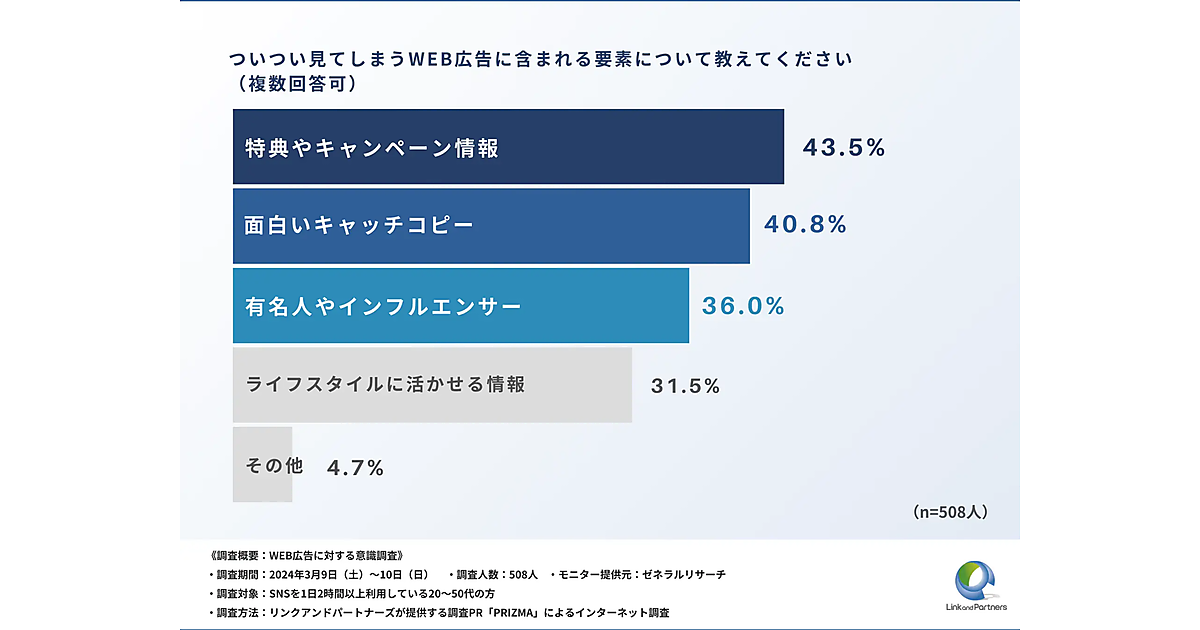 リンクアンドパートナーズは、「WEB広告に対する意識調査」を実施した。SNSを1日2時間以上利用している20〜50代の男女508名を対象に調査している。