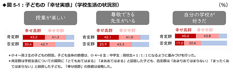 学校生活の状況では、「授業が楽しい」を肯定する子ども(肯定群)は「幸せ高群」が43.2%であるのに対して、否定する子ども(否定群)は20.4%と20ポイント以上の差がある。「尊敬できる先生がいる」「自分の学校が好きだ」でも同程度の差が見られた。