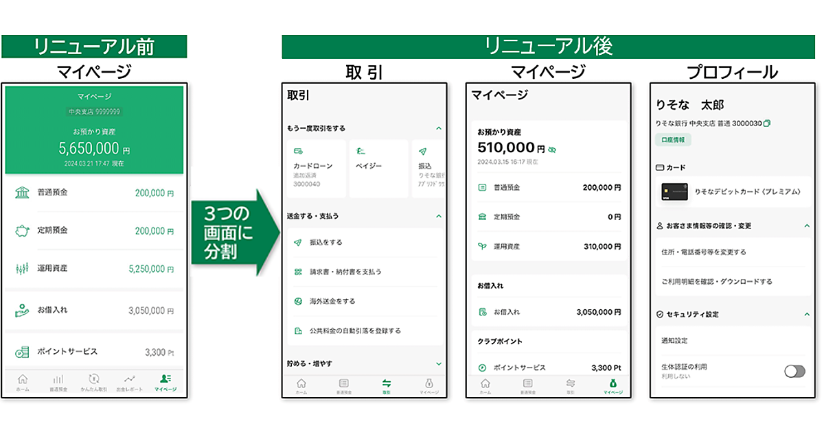 りそなグループのりそな銀行、埼玉りそな銀行、関西みらいフィナンシャルグループ傘下の関西みらい銀行は、「りそなグループアプリ」のデザインをリニューアルすると3月22日に発表した。「マイページ」経由で各機能に至る構造から、振込などの「取引」、預金残高や運用など資産状況を確認する「マイページ」、利用者情報を変更できる「プロフィール」の3つ画面に切り出し、したいことがすぐに見つかる画面構成に一新した。