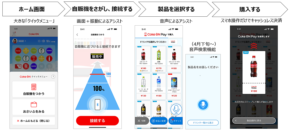 Coke ONはこれまで、自販機の高い場所のボタンに手を伸ばすことなく手元のスマートフォン操作でキャッシュレスで買える機能や、大きな文字のメニュー、スマートフォンのバイブ振動と連動して近くの自販機を探し接続する機能を搭載した。今回、アプリの文字や操作ボタンのサイズを拡大。4月下旬には自販機内の製品を音声で選ぶ機能を追加する。
