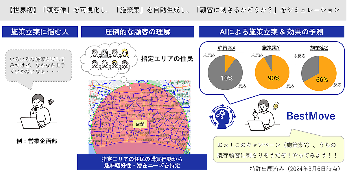 生成AI、消費者属性拡張、知見発見や施策立案に関する技術といったNECのAI技術群と、統計化されたクレジットカード決済情報など購買データを利用することで、地域・店舗の想定顧客の潜在ニーズを特定すると同時に、最適な施策の立案を可能にする。施策案への顧客の反応率がシミュレーションでき、費用対効果の高い施策案だけの実行を実現する。