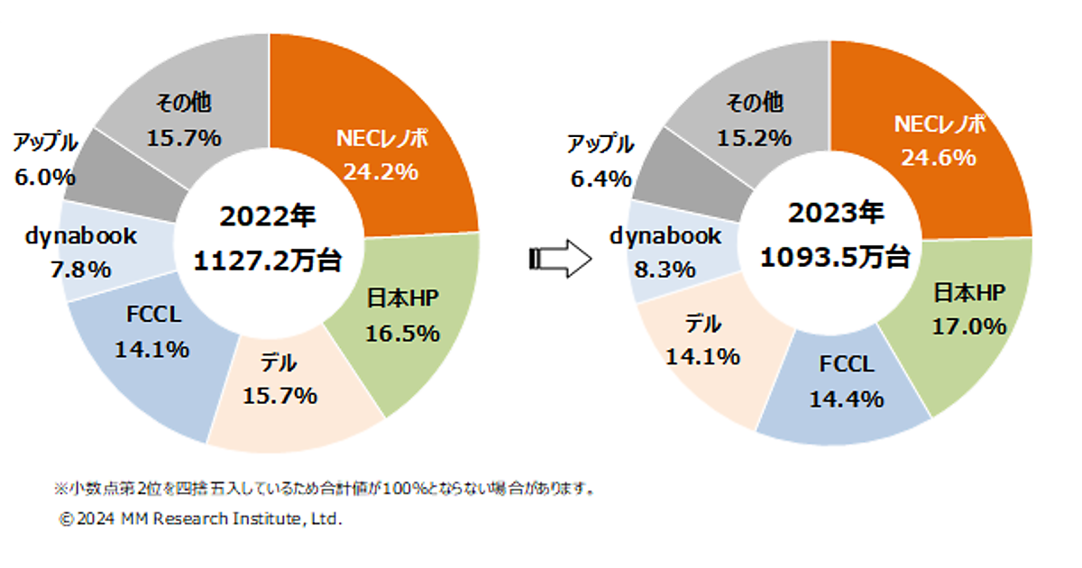 MM総研は、2023年における「国内のパソコン出荷台数」に関する調査結果を発表した。2023年(2023年1~12月)の国内パソコンについて出荷台数・出荷金額を算出。メーカー別シャアなどを分析している。