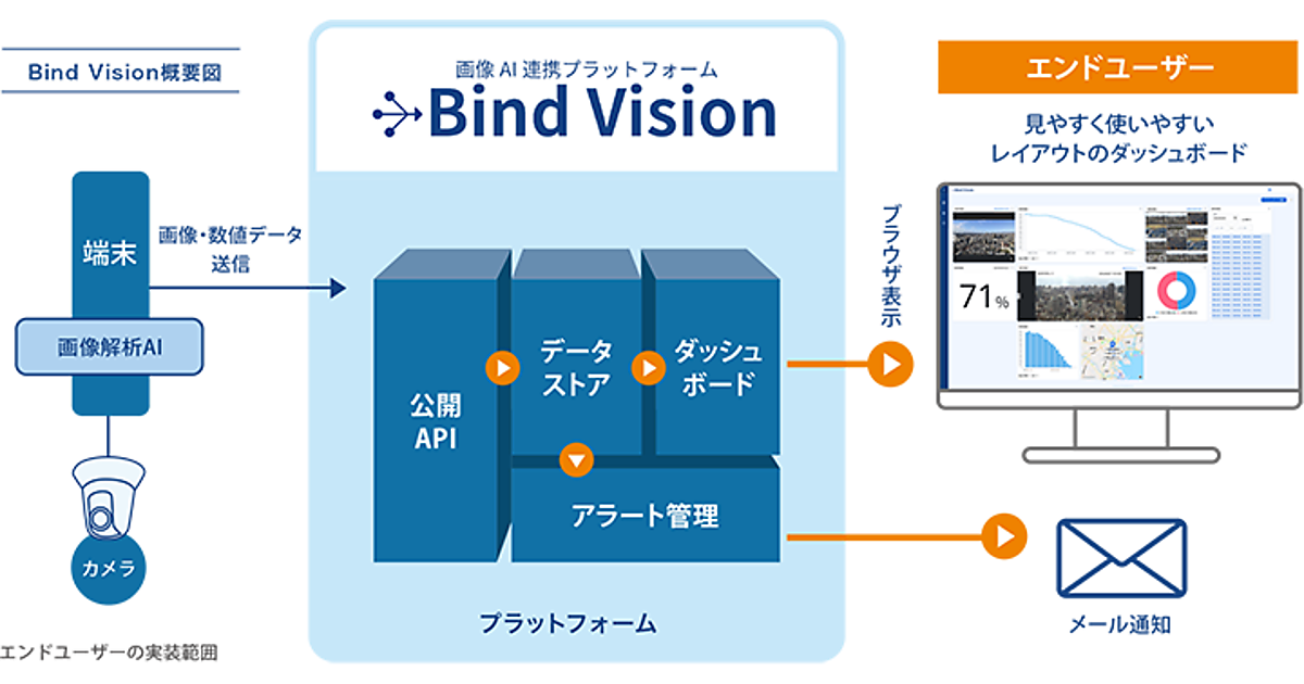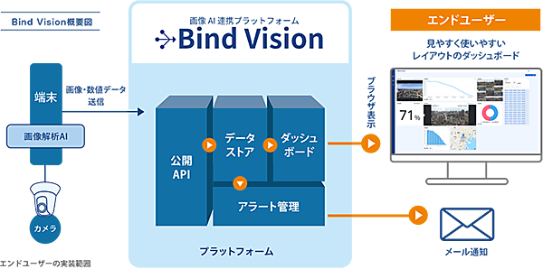 目視の代わりになるAIでの画像解析市場が成長する中、画像解析AIシステムの開発では認証やセキュリティ機能を備えたユーザーインターフェースを提供するウェブシステムが大きな割合を占めるため支援する。Bind Visionはウェブシステム機能「プラットフォーム」をベースに独自開発の画像解析AI「クラウドAI」と「エッジ AI」で構成する。