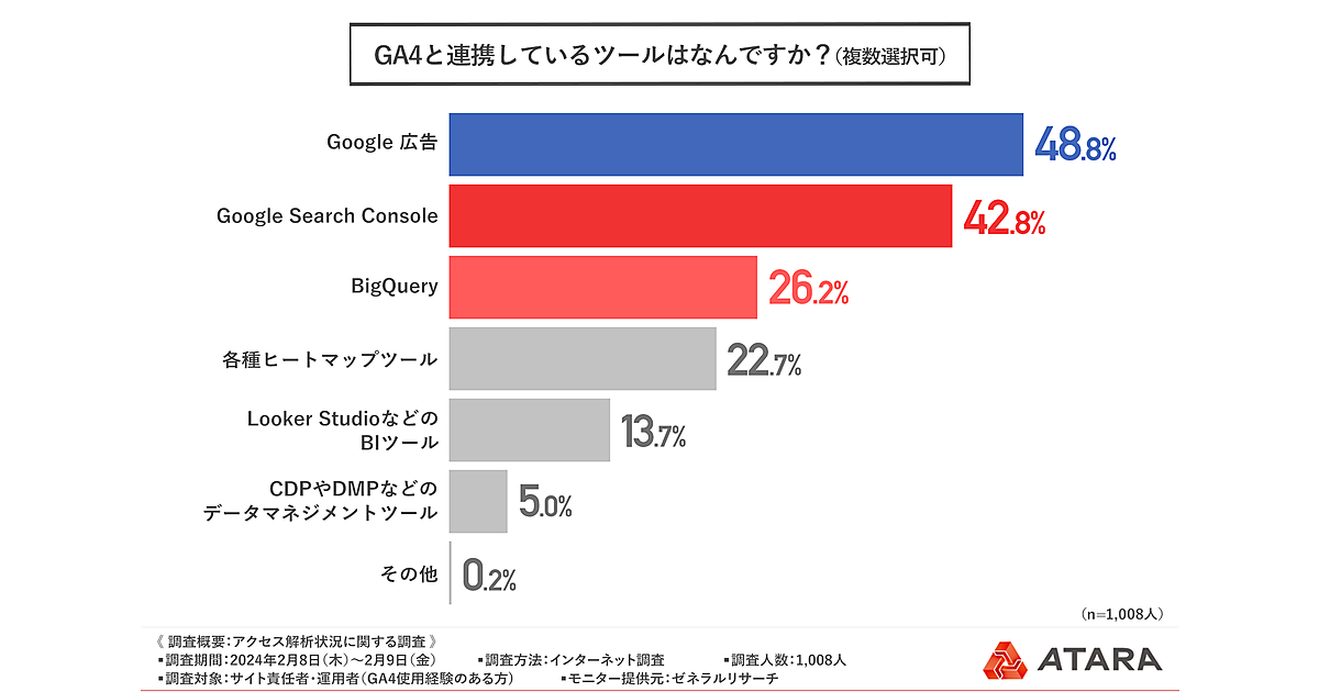 また、GA4と連携しているツールについて聞くと、「Google 広告」が48.8%、「Google Search Console(サーチコンソール)」が42.8%で圧倒的。以下、「BigQuery」「各種ヒートマップツール」「Looker StudioなどのBIツール」などが続いた。