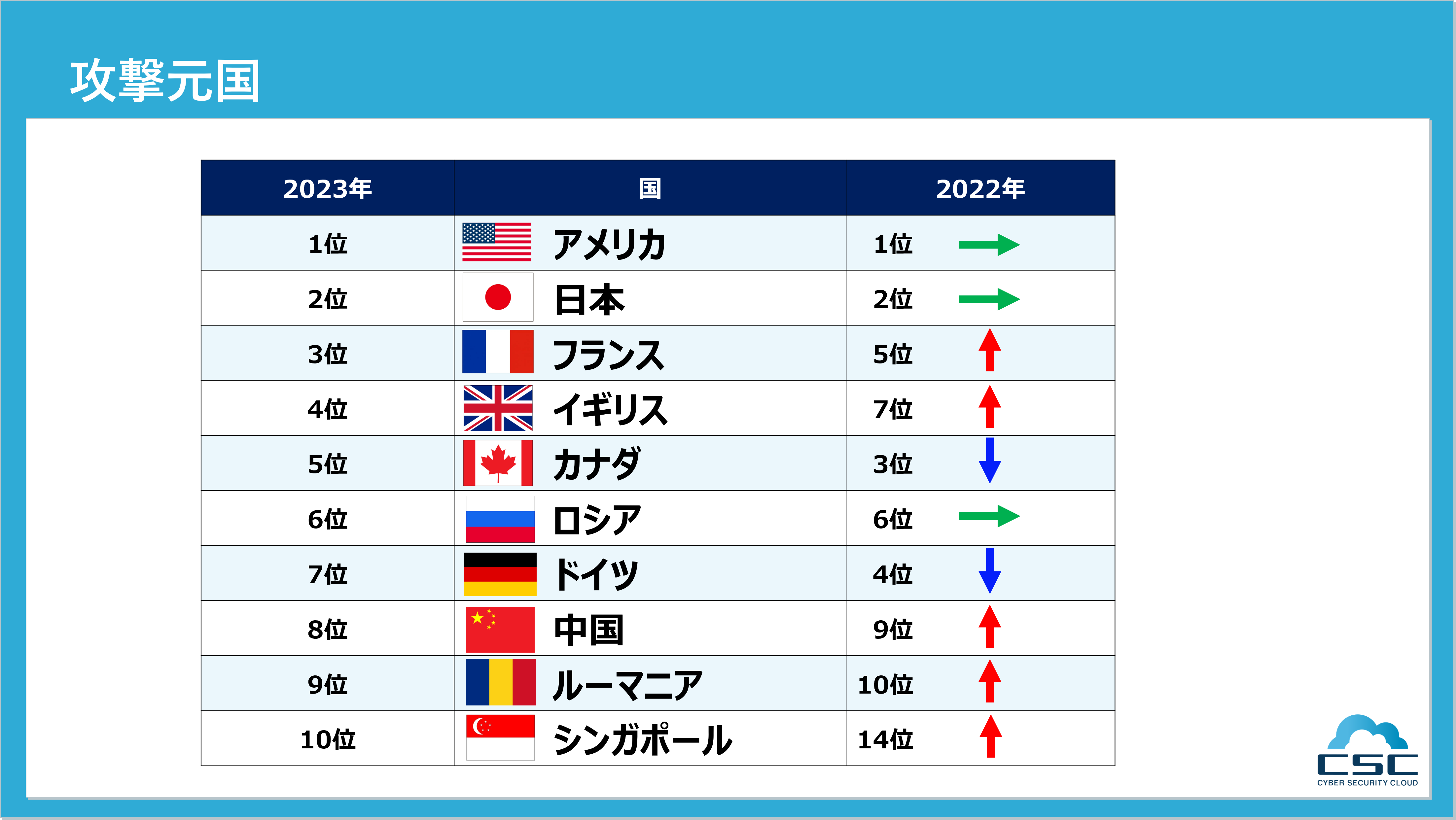 検知された攻撃元を国別に見ると、攻撃件数の上位は1位は「アメリカ」、2位は「日本」、3位は「フランス」となった。2022年との比較では大きな順位変動はなかったが、「シンガポール」は14位→10位に順位を上げていた。