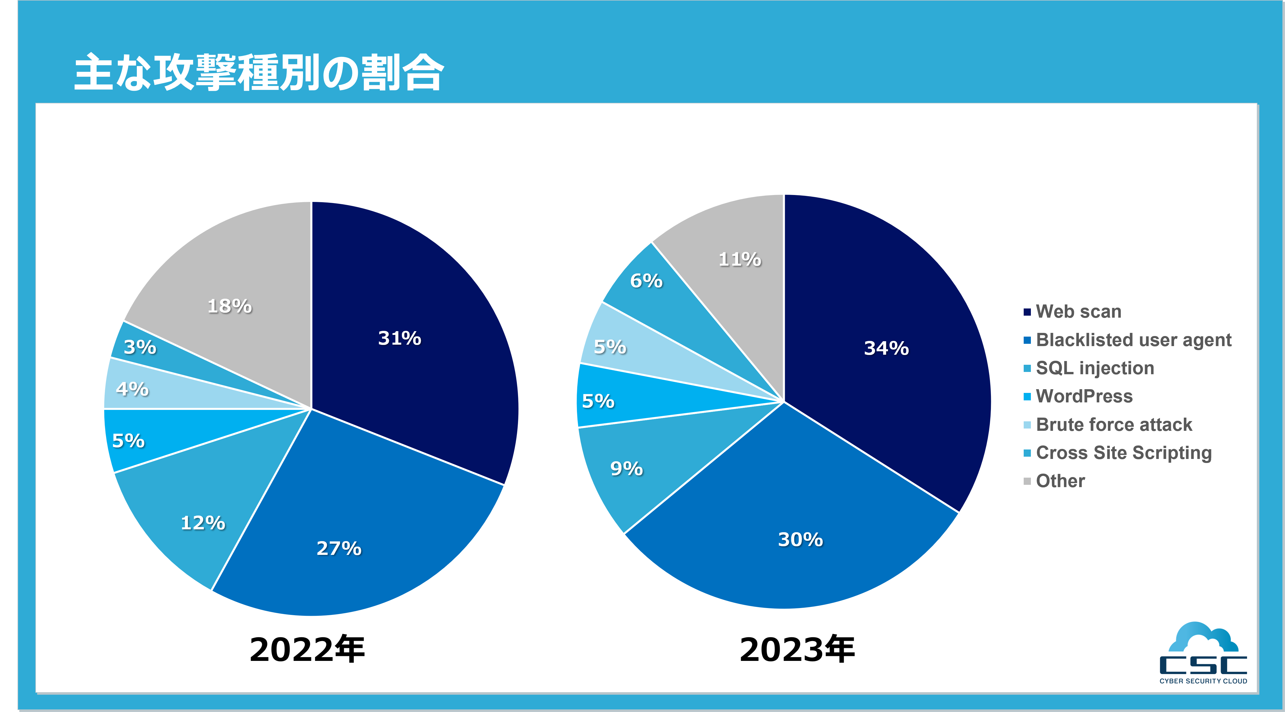 主な攻撃種別の割合としては、攻撃の対象を探索・調査、また無作為に行われる単純な攻撃で脆弱性を探すなどの“攻撃の予兆”である「Web scan」が34%、脆弱性スキャンツールなどを利用したBotによる攻撃である「Blacklisted user agent」が30%を占めた。増加率としては、WordPress(ワードプレス)やMovable Type(ムーバブルタイプ)などCMSを狙った攻撃の増加が顕著だった。