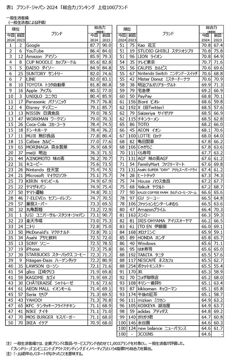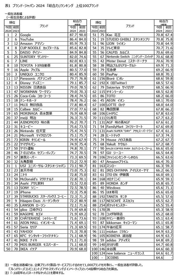 その結果、一般生活者編「総合力」ランキングでは、Googleが87.7pt(偏差値)のスコアで6年ぶりの首位となった。以下「YouTube」「アマゾン」「カップヌードル」「ダイソー」がトップ5に入った。