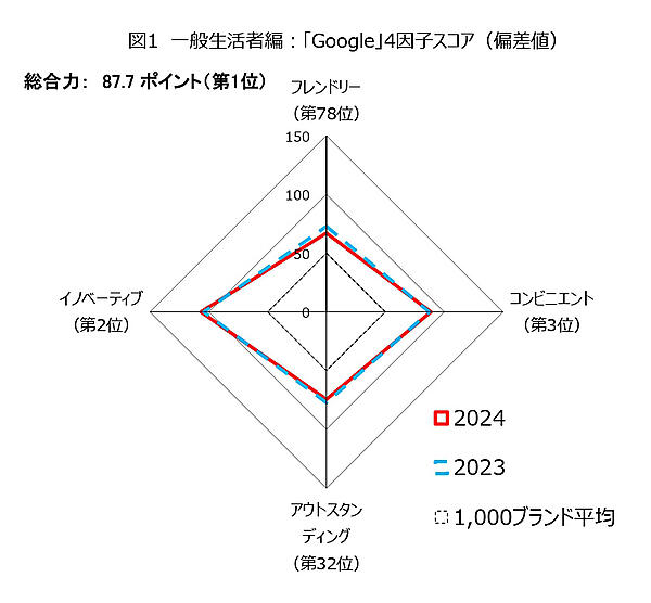 この調査では、「フレンドリー(親近性)」「コンビニエント(利便性)」「アウトスタンディング(卓越性)」「イノベーティブ(革新性)」という4指標でブランド価値の「総合力」を算出。一般生活者編は企業ブランドと製品・サービスブランド合わせて1,000ブランドが対象、ビジネス・パーソン編では500の企業ブランドを対象としている。