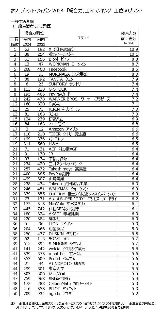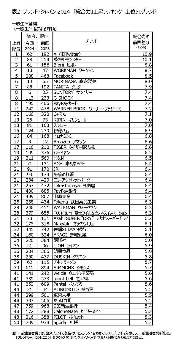 総合力の上昇ランキングでは、「X(旧Twitter)」10.9pt増、「ポケットモンスター」10.1pt増が上位だった。また日焼け止めミスト「ビオレUVアクアリッチ アクアプロテクトミスト」が大ヒット商品となった「ビオレ」もランクインしている。