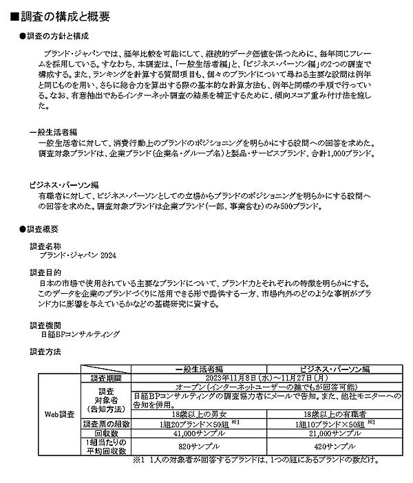 ブランド・ジャパンは、一般生活者とビジネス・パーソンが国内ブランドを評価するプロジェクト。2001年からスタートし今回で24回目。