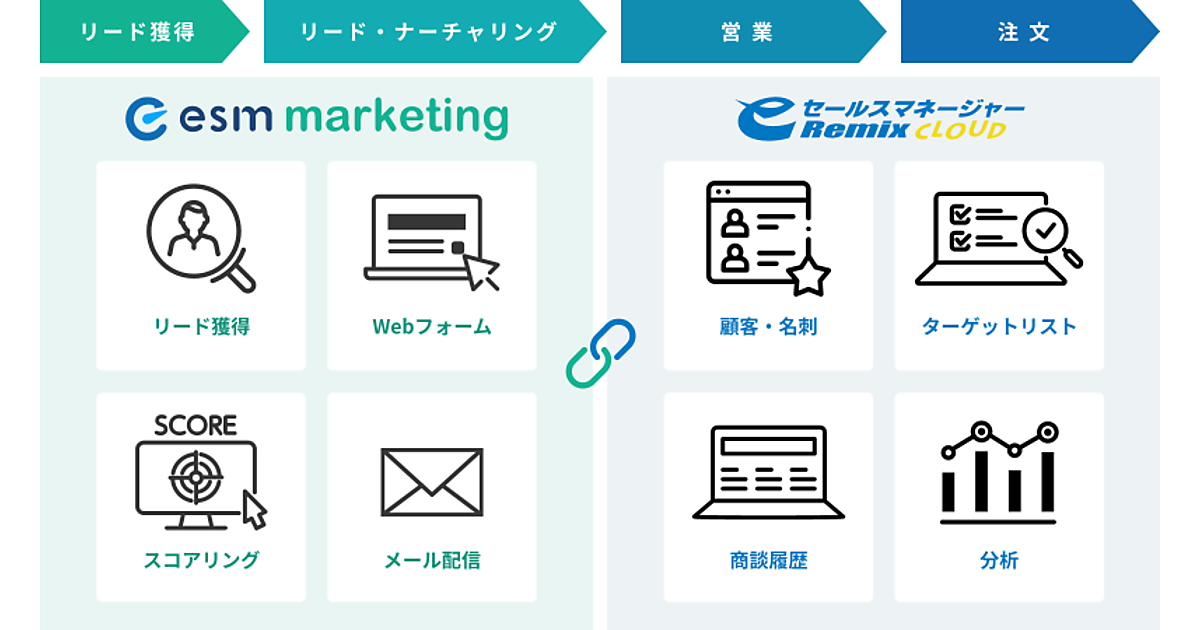 eセールスマネージャーRemixのユーザーからマーケティングと営業の連携に関する相談が寄せられていたため、MA機能となるesm marketingを提供する。esm marketingには見込み客の獲得、育成、管理の各機能があり、リード獲得・ナーチャリング(顧客育成)と商談の担当者が異なっていても、顧客が検討するタイミングを逸すことがなくなる。