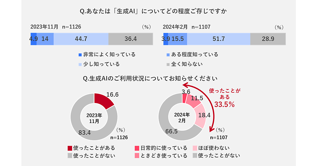 GMOリサーチは、「AIの利用トレンド」に関する調査結果を発表した。日本国内15歳以上の男女1,107人が回答している。2023年11月に初めて実施し今回(2024年2月)が2回目。この3か月間での推移を分析している。