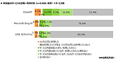 利用状況について聞くと「使ったことがある日と」(日常的に使っている・ときどき使っている・ほぼ使わない)は33.5%(前回調査では16.6%)と倍増した。一方「使ったことがある人」に利用頻度を聞くと半数以上(全体の18.4%)が「ほぼ使わない」と回答しており、あくまで“お試し”にとどまっている印象だ。
