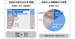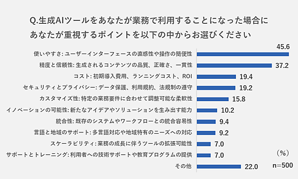 回答者のうち有職者500人(パート・アルバイトを除く)に「生成AIを業務利用する場合に重視するポイント」を聞くと「使いやすさ」45.6%、「精度と信頼性」37.2%が上位。それに「コスト」19.4%、「セキュリティとプライバシー」19.2%が続く。