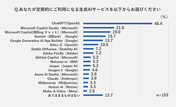 生成AIを「日常的に使っている」「ときどき使っている」と回答した153人に「定期的に利用している生成AIツール(複数回答可)」を具体的に聞くと、「ChatGPT」48.4%が最多で、以下「Microsoft Copilot Studio」21.6%、「Microsoft Copilot[旧Bingチャット]」19.0%、「Gemini(旧Bard)」15.7%、「Google Generative AI App Builder」13.7%の順となった。自社AIを構築するための法人向けツール「Microsoft Copilot Studio」「Google Generative AI App Builder」の順位が高く、企業が開発に取り組んでいる様子がうかがえる。