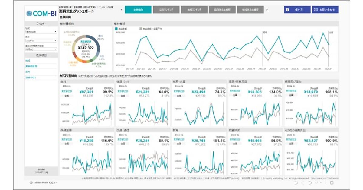 ポイント・マーケティング事業を手掛け、共通ポイントサービス「Ponta(ポンタ)」を運営するロイヤリティマーケティング(LM)は、総務省統計局の「家計調査」のデータを基に視覚化したダッシュボードを4月9日に公開した、と同日発表した。毎月の消費支出全体の傾向、地域別・品目別の支出推移、ランキングなどが手間なく容易に確認できる。