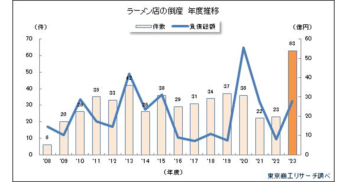 2023年度「ラーメン屋」の倒産、過去最多の63件。前年度の2.7倍に急増【東京商工リサーチ調べ】