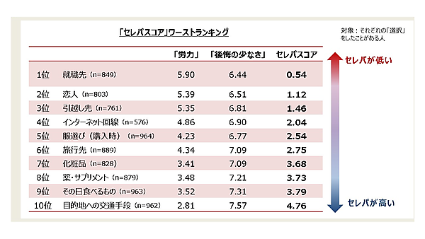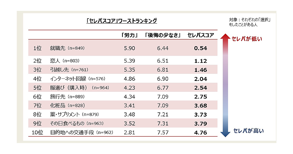 さらに具体的な体験について「セレパスコア」をランキングすると、もっともセレパが悪かった行動は「就職先選び」0.54だった。以下「恋人選び」1.12、「引越し先選び」1.46が続く。人生の大きなイベントで“思っていたのと違う”となってセレパの悪さを感じたようだ。逆に「目的地への交通手段の選択」「その日食べるものの選択」「薬・サプリメント選び」は、致命的とまでならずセレパが高い。