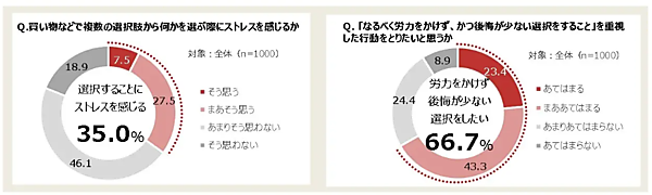 まず「複数の選択肢から何かを選ぶ際にストレスを感じるか」を聞くと、「そう思う」+「まあそう思う」の合計は35.0%。さらに「なるべく労力をかけず、かつ後悔が少ない選択をすることを重視したい」としたのは、「あてはまる」+「まああてはまる」の合計で66.7%に達している。