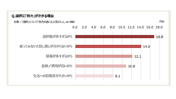 そこで、「選択において労力がかかる」と回答した982人にその理由を聞くと、「選択肢が多すぎるから」16.8%が最多で、「使ってみないと良し悪しが分からず迷ってしまうから」14.0%、「情報が多すぎるから」12.1%が続いた。