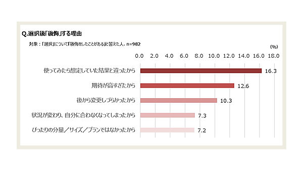 さらに「選択の後に後悔したことがある」と回答した982人にその理由を聞くと、「使ってみたら想定していた結果と違ったから」16.3%が最多で、「期待が高すぎたから」12.6%、「後から変更しづらかったから」10.3%といった声があがった。選択肢が多かったのにチョイスを間違え事態も取り戻せない場合にセレパが悪くなるようだ。