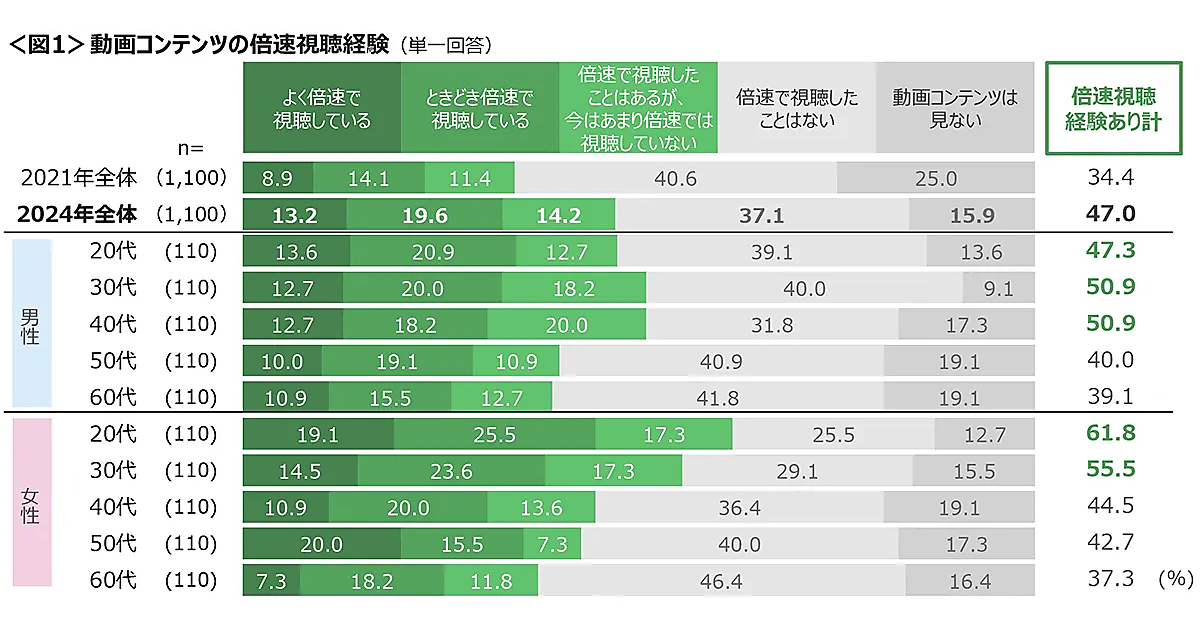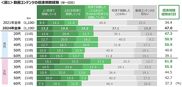 クロス・マーケティングは、「動画の倍速視聴」に関する調査結果を発表した。全国20歳~69歳の男女1,100人が回答している。