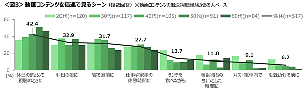 どういうときに倍速で見ているかを聞くと、高齢者は「休日のまとめて視聴」が多いが、20代は「ランチを食べながら」「順番待ちの時間」などのスキマ時間が多く、習慣化している様子がうかがえる。