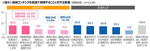 倍速視聴に対する意識を聞くと、「倍速で見るもの・見ないものを分けている」が最多だが「自由度が上がる」「効率よくたくさん視聴できる」という意見も多い。女性20代・30代では「効率よくたくさんの動画を視聴できる」、男性20代では「倍速で見ないと時間を損した気になりそう」「集中して視聴できる」が高く、若い世代では特に時間効率を意識している様子がみられた。